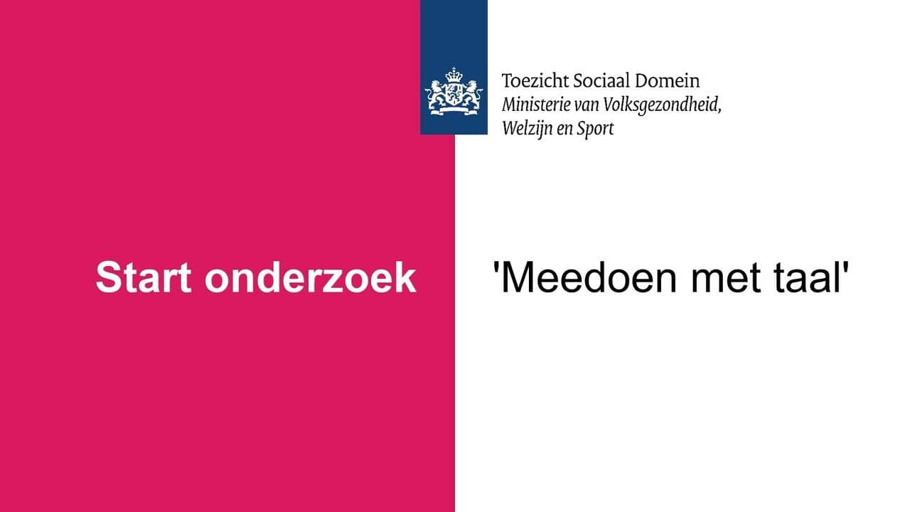 Logo Toezicht Sociaal Domein, onderdeel van het Ministerie van Volksgezondheid, Welzijn en Sport. Titel: Start onderzoek 'Meedoen met taal'.